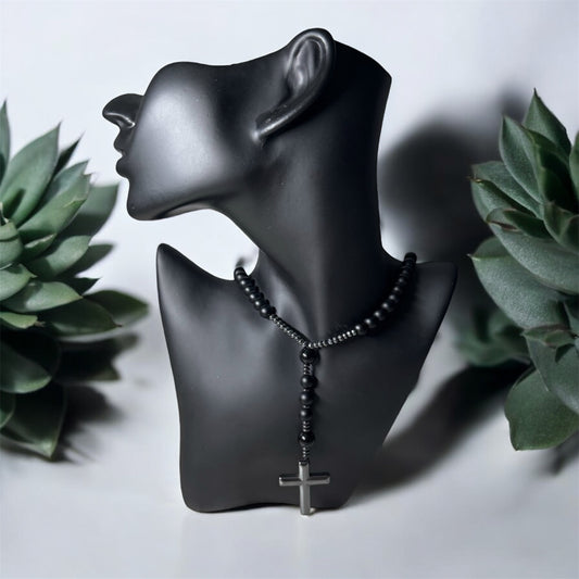 Naszyjnik Różaniec z Krzyżem Czarny Turmalin Hematyt Obsydian Naturalny